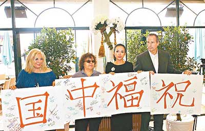 章子怡(右二)與數(shù)名外籍人士手持“祝福中國”的簽名卡,以示心系家鄉(xiāng)。