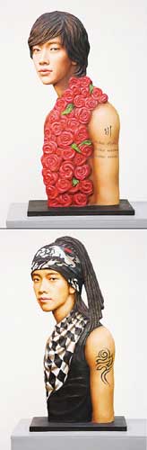 韓國雕刻家曹廷近日為韓國天王Rain制作了兩款雕像,第一款造型中Rain赤裸上身僅以玫瑰花纏身,而第二個的風格則完全不同,Rain扎了一個Hip-Hop款式的頭型。這兩款雕像9月份將在北京展出。