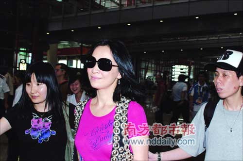 與以往大隊人馬護前應后的場面不同的是,此番劉嘉玲一行只有二人,走出安檢后,一名女子上前接應。劉嘉玲一路電話未停,手拎新款粉色香包,鑲嵌銀飾的馬甲格外耀眼。