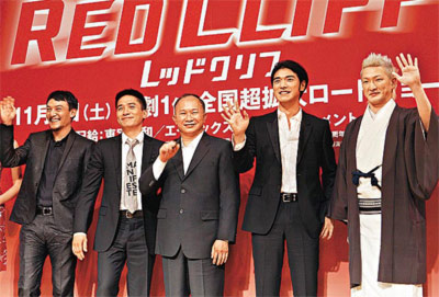 左起:張震、梁朝偉、吳宇森、金城武及中村獅童等,昨日現身日本出席《赤壁》記者會。