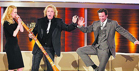 妮可(左)上節(jié)目吹奏澳洲土著樂(lè)器,銀幕搭檔休·杰克曼(右)金雞獨(dú)立。