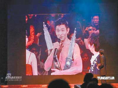 前晚(12月26日,下同),香港四大頒獎典禮之一的“新城勁爆頒獎禮2007”在灣仔會展中心舉行。劉德華、陳奕迅以及李克勤分奪5個獎項,成為全場之冠。由于劉德華前晚正在紅館舉行演唱會,無法到達頒獎現場,主辦方竟把獎杯送到華仔演唱會現場,華仔第一次赤裸上身抱回5獎。