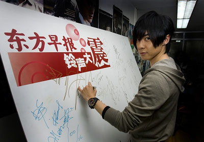 由于活動推遲了20分鐘,唐禹哲還未坐定,電話便響個不停,而唐禹哲來不及喝口水潤喉便認真地與FANS聊起來。聽說這位打進電話的FANS,正是在前日簽售會上為自己送禮物的人,唐禹哲連連道謝,“我看到大家托你送的很大一包東西了,我很喜歡,我會帶回臺灣去的。”聽出FANS對他的話持著半信半疑的態(tài)度,唐禹哲又反復(fù)強調(diào),“我有拆開來看過,是玉和胸章對吧!”讓對方受寵若驚忍不住尖叫。
