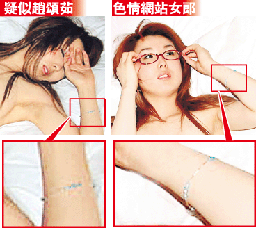 報道說,上身赤裸的相中人,無論發型及樣貌均與趙頌茹相似,涂有粉紅色指甲油,左臂戴有一條淺藍色珠仔手鏈,但身形較趙頌茹略胖。網友昨晚找來的另一批半裸照,則來自日本一個成人網站,相中女郎與趙頌茹有幾分相像,同樣在左臂戴有一條淺藍色珠仔手鏈,也同樣是躺在鋪有白色床單的床上,其所穿的內褲亦與被指貌似趙頌茹女子所穿的款式一樣,因此極可能只是“人有相似”。
