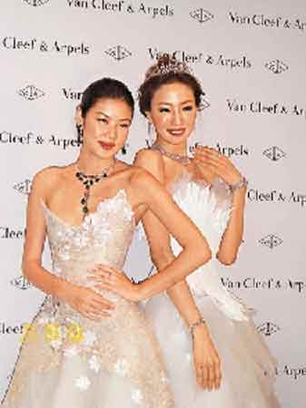 中新網5月23日電 據香港文匯報道,樂基兒和陳嘉容前晚齊齊穿起婚紗為一個珠寶品牌行走秀,樂基兒還戴上價值逾三千萬元的綠寶鉆飾,艷壓全場。