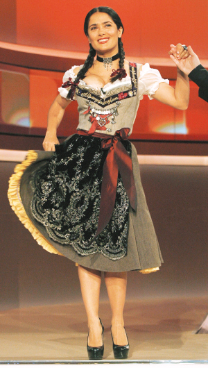 墨西哥性感女星薩爾瑪·海耶克近日盛傳與法國名牌大亨皮諾前日登上德國電視節(jié)目《Wettendass...?》,并穿上當(dāng)?shù)貍鹘y(tǒng)服飾大跳土風(fēng)舞,低胸的上衣令其36C上圍呼之欲出,連同場的名牌Chanel設(shè)計(jì)師“老佛爺”卡爾·拉格菲爾德也看得目不轉(zhuǎn)睛。