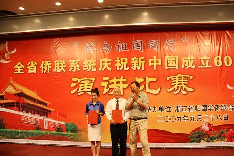 為慶祝新中國成立六十周年,浙江省僑聯于9月28日下午,在浙江圖書館二樓報告廳舉辦了以“僑與祖國同行”為主題的全省僑聯系統演講比賽活動,由各市僑聯推薦的、來自全省僑界各行各業的19名參賽選手參加了比賽活動。