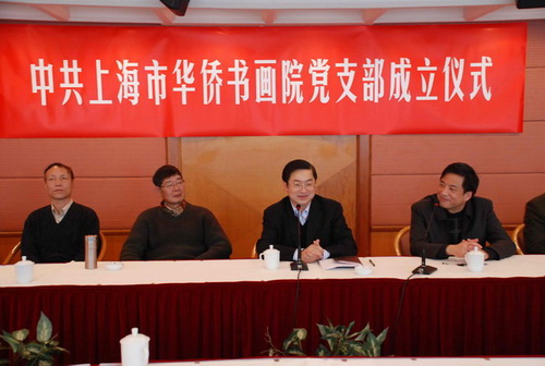 上海市僑辦主任、黨組書記崔明華出席并講話。他高度評價了華僑書畫院的書畫家們在弘揚中華優秀傳統文化、熱衷社會公益事業等方面作出的積極貢獻,向加入書畫院黨組織的黨員書畫家們表示熱誠地歡迎。