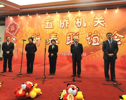 中新網2月12日電 據中國僑聯網消息,虎步奔騰開勝景,春風浩蕩展鴻圖。2月8日下午,首都大酒店洋溢著節日的喜慶氣氛。中央“五僑”機關在這里隆重舉行2010年新春聯歡會!拔鍍S”機關干部職工和離退休老干部400多人歡聚一堂,喜迎新春佳節。