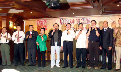 中新網(wǎng)2月22日電 據(jù)《南美僑報(bào)》報(bào)道,為了歡迎到秘魯訪演的“文化中國·四海同春”南美藝術(shù)團(tuán),以中華通惠總局為首的利馬各華人社團(tuán),21日晚在富臨門酒店舉行盛大歡迎晚會,國務(wù)院僑辦副主任馬儒沛、中國駐秘魯大使趙五一和通惠總局三位主席蕭孝權(quán)、周銳波、楊學(xué)勤等近五百人出席了晚會。