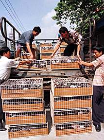 廣州舉行“信鴿競翔報歸訊”活動 作者:李懷德 象征1999年的1999只信鴿將于九月九日在澳門的大三巴牌坊前放飛返回廣州。這項名為“信鴿競翔報歸訊”的活動,將揭開九月十一日澳門回歸祖國倒計時一百天紀念活動的序幕。圖為廣州市信鴿協會正將征集的信鴿運往澳門。 |