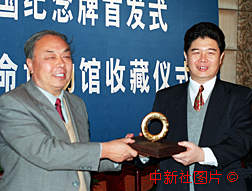 "澳門回歸紀(jì)念牌" 作者:董會峰 由香港著名設(shè)計師宣小英設(shè)計的"澳門回歸紀(jì)念牌",三日在北京由發(fā)行單位中國安徽國際經(jīng)濟(jì)技術(shù)合作公司將"0001"號捐獻(xiàn)給中國革命博物館作永久收藏。 |