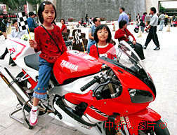 中新社傳真 毛建軍 攝 澳門十三日舉行澳門格蘭披士大賽車嘉年華活動,以推廣即將開始的第四十六屆澳門格蘭披士大賽車。一名兒童騎上停放在現場的1000CC格蘭披士電單車"擺甫士"照相。 |