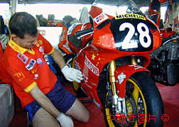 中新社傳真 毛建軍 攝 第四十六屆澳門格蘭披士大賽車即將開始,一支代表中國某集團公司出賽的摩托車隊正在進行車輛的賽前調試。 |