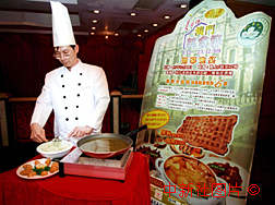 中新社傳真洪少葵攝 為慶祝澳門(mén)回歸祖國(guó),香港新光酒樓將於十二月一日舉辦盛大的"慶回歸澳門(mén)美食節(jié)",以澳葡菜為主筵開(kāi)六十多席,圖為澳門(mén)木偶餐廳的大廚推介富有特色的"薯絲馬介休"美食。 |