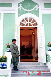 澳門保安人員在葡國建筑特色的博物館前執勤 一名澳門保安人員在葡國建筑特色的博物館前執勤,回歸前的一些公共場所加強了治安保衛。中新社傳真 |