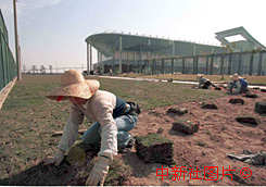 澳門政權(quán)交接儀式會(huì)場(chǎng)外鋪設(shè)草坪 澳門回歸前夕,女工在政權(quán)交接儀式會(huì)場(chǎng)外鋪設(shè)草坪. 中新社傳真 王瑤 |