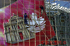 澳門大廈高掛慶祝回歸彩塑 澳門著名的葡京賭場鄰近的大廈上正高掛慶祝回歸彩塑,古老的大三巴圖像配以象征回歸的蓮花標志。