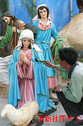 澳門市工人在街頭裝飾圣經故事人物塑像,迎接圣誕節的到來。 中新社傳真 毛建軍攝 |