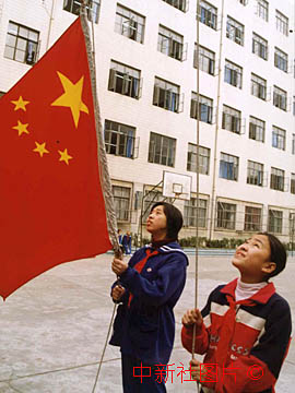 作者:王張雄 上海東風中學虞維詩(右)是澳門籍學生,在澳門回歸前的這一個星期中,學校特地將每天清晨升國旗的任務交給她。圖為虞維詩17日與同學一起升國旗的情景。