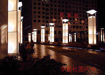 澳門政權交接場地外的迎賓路兩邊豎立透明燈柱,富于現代藝術氣息。 中新社數碼傳真 賈國榮攝 |