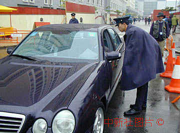 澳門警察十八日冒雨在政權交接場地周圍檢查車輛,疏導交通。中新社數碼傳真 |