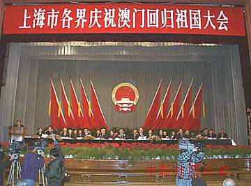 申城各界人士二十日在上海友誼會堂隆重舉行慶祝澳門回歸祖國大會,上海市黨政領導和有關方面人士千余人出席了大會。作者:吳達 |