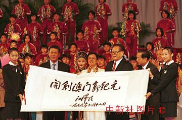 江澤民主席二十日上午出席澳門特區成立慶祝大會時,向澳門特區政府贈送書有“開創澳門新紀元”的橫幅。 中新社傳真 李剛攝 |